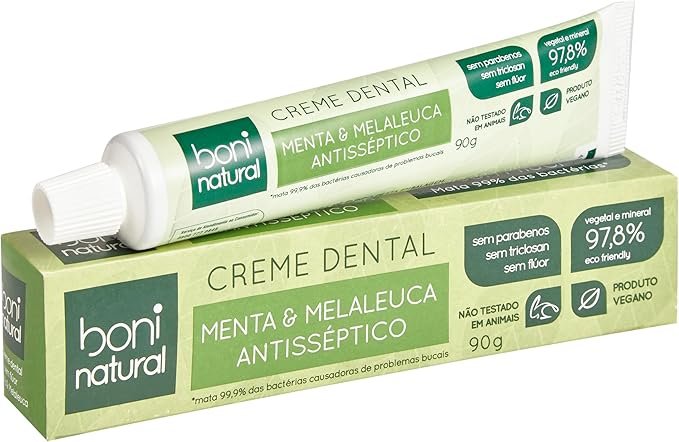 / Creme Dental com óleos naturais de Menta e Melaleuca Vegano e Natural, Sem Flúor, Sem Triclosan, Boni Natural, Branco